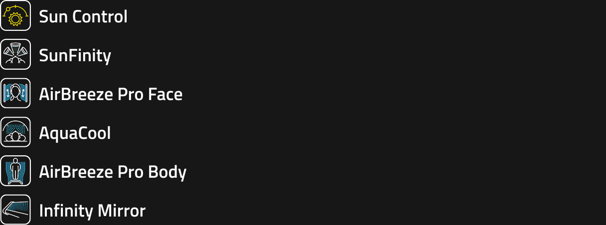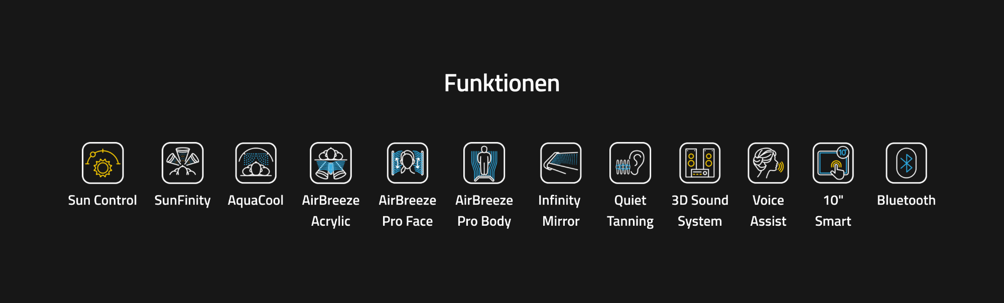Erlebe die nächste Generation von Sonnen- und Beautytechnologie: modernste LED-Bräunung mit extrem präziser Lichtsteuerung, ein tiefenwirksamer Collagen-Boost für sichtbar glattere Haut und ein unvergleichlicher Premium-Komfort, der jedes Sonnenbad in ein luxuriöses Wellness-Erlebnis verwandelt – alles vereint in einem der fortschrittlichsten Geräte seiner Klasse.
